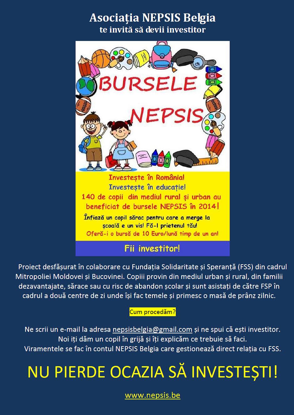 În urmă cu un an de zile, Asociatia NEPSIS Belgia în parteneriat cu Fundația Solidaritate si Speranță (FSS) din cadrul Mitropoliei Moldovei și Bucovinei și Asociația Tineretului Ortodox Român (ATOR) lansa proiectul de burse „Investește în România. Investește în educație!„Cu sprijinul dumneavoastră am reușit să aducem puţină lumină și bucurie în sufletele a 140 de copii proveniţi din familii dezavantajate, sărace, din mediul urban și rural. Bursa NEPSIS a însemnat pentru ei posibilitatea continuării studiului – speranța unei vieti mai bune și încredere în viitor!În luna noiembrie vom trage linie și vom analiza realizările….și, cu siguranţă, ne vom propune mai mult pentru anul următor!Pe cei care s-au înscris în proiect dar au achitat parțial (sau deloc) sumele aferente îi rugăm să ne comunice cât mai curând dacă doresc să rămână alături de noi în această misiune.Vă reamintim coordonatele bancare :IBAN: BE23 0016 4159 8391Beneficiar: NEPSIS – BE ASBLComunicare: Bursă NEPSIS „Nume copil”/ „Perioada”SWIFT: GEBABEBB BNP ParisbasEste important ca la „Comunicare” să treceţi numele bursierului precum și perioada pentru care faceţi plata.